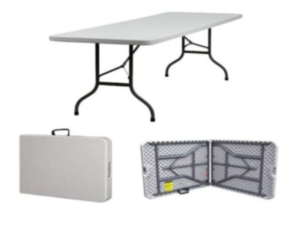 Our 1.8m folding table is made with a durable blow-moulded plastic top and a sturdy powder-coated steel frame, weighing 11kg. Its robust design ensures stability and support for all your needs.